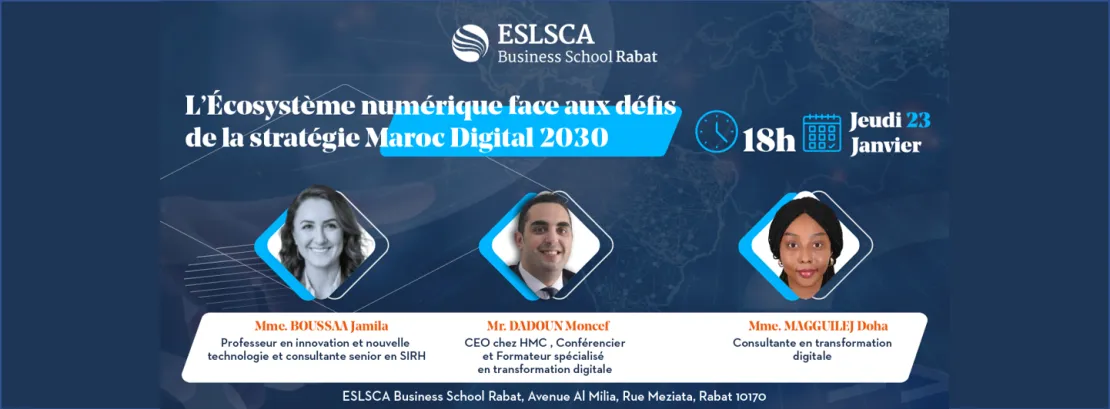L'ESLSCA Business School Rabat a le plaisir de vous convier à la conférence prévue le 23 Janvier 2025 à partir de 18h sous le thème :