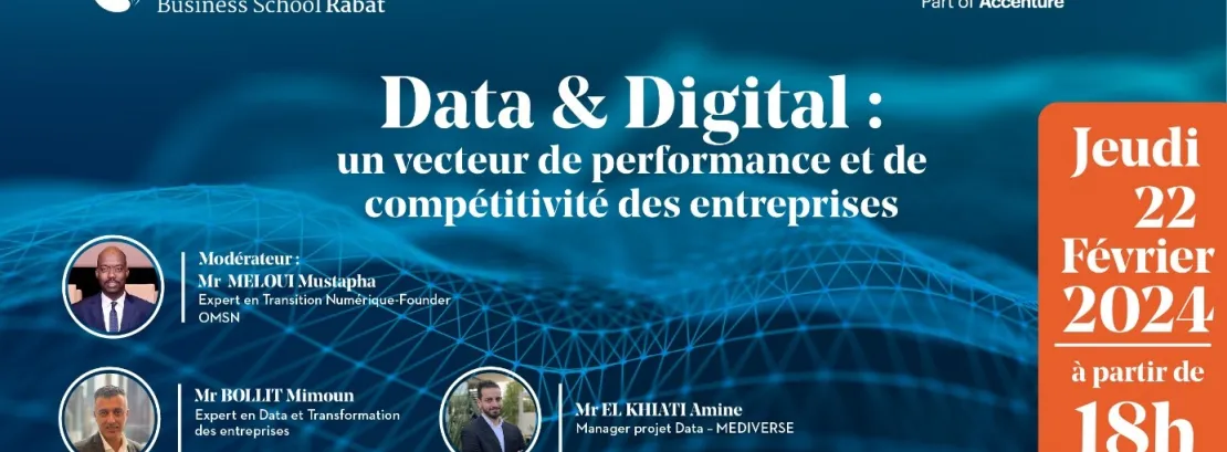 ESLSCA Business School Rabat, en partenariat avec l’AFD Tech, ont le plaisir de vous convier au séminaire "Data & Digital : Levier de Performance et Compétitivité des entreprises " qui aura lieu le Jeudi 22 Février 2024 au Campus Hay Riad à 18h (Rabat Time).