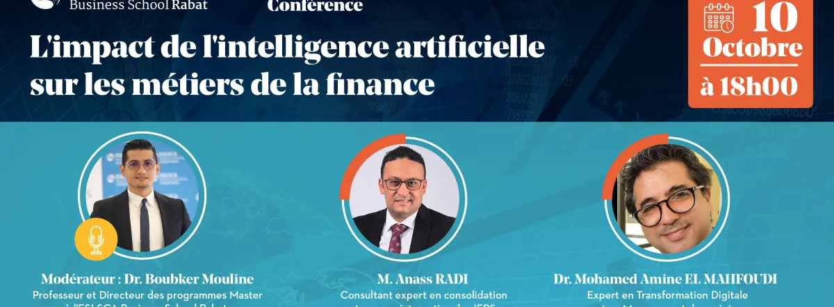 L'ESLSCA Business School Rabat a le plaisir de vous convier à une conférence-débat qui portera sur le thème captivant : « L'impact de l'intelligence artificielle sur les métiers de la finance ». Cette rencontre aura lieu le Mardi 10 Octobre à 18h et sera animée par le Dr. Boubker Mouline, Professeur et Directeur des programmes Master à l'ESLSCA Business School Rabat.