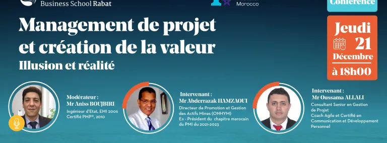 L'ESLSCA Business School Rabat, en partenariat avec Project Management Institute Morocco, ont le plaisir de vous convier à une conférence qui portera sur le thème captivant : « Management de projet et création de la valeur : illusion et réalité »