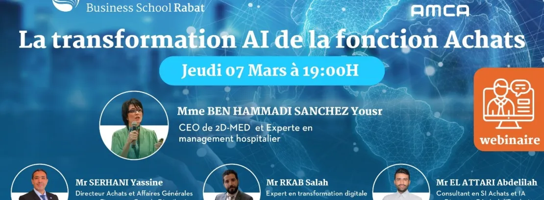 Ce webinaire aura lieu Le Jeudi 07 Mars 2024 à 19h ( Rabat Time) , et connaîtra l’intervention de plusieurs experts des écosystèmes de l’IA et des Achats
